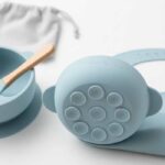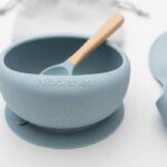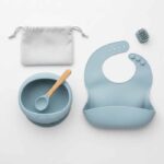 All-in-one feeding kit with silicone suction bowl, soft-tip spoon, spill-proof cup and portable bib – BPA-free and dishwasher safe.