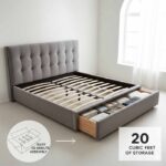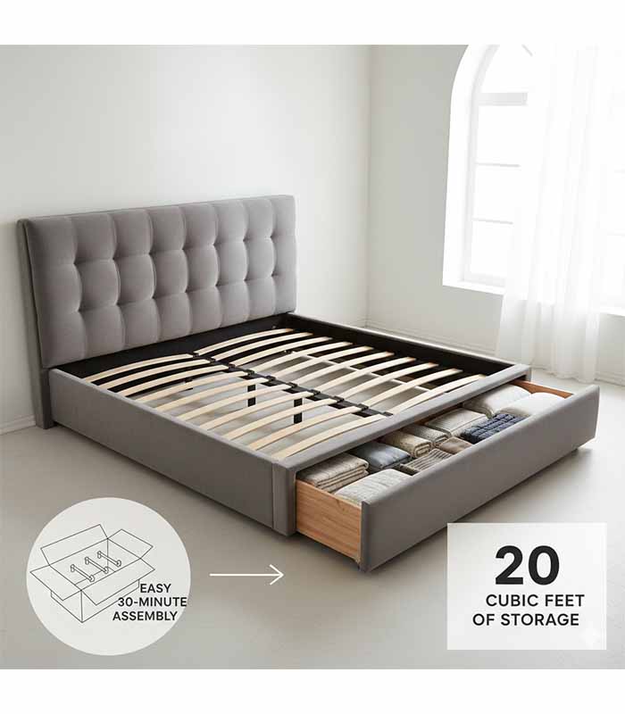 Low-profile upholstered platform bed with hidden under-bed drawer storage, soft headboard and easy assembly — modern bedroom solution for small spaces.