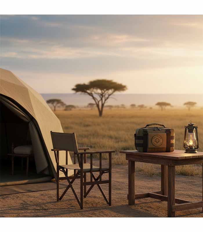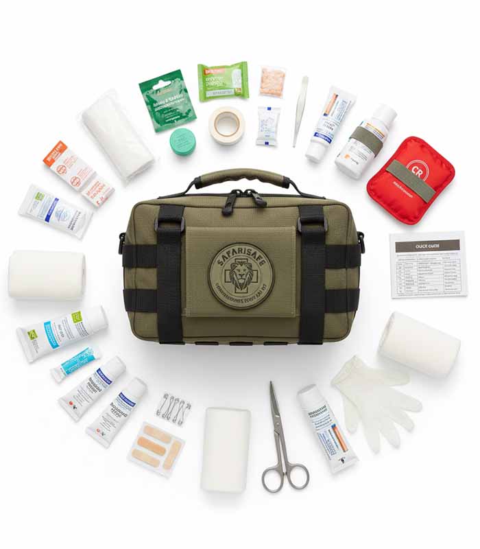 Compact, portable first aid kit with bandages, antiseptics, and emergency tools for safari, hiking, and camping trips.