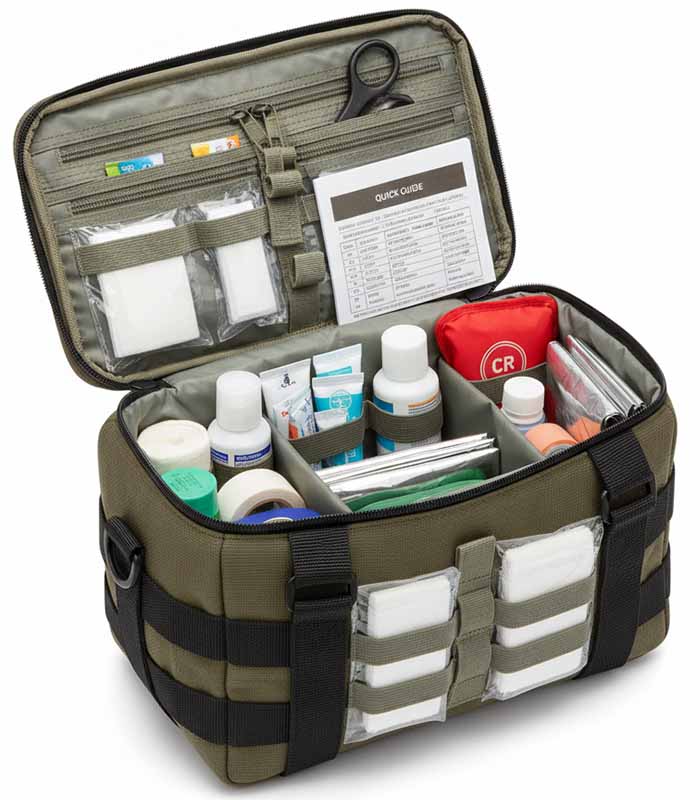 - Includes over 50 essential medical items (bandages, antiseptics, tweezers).