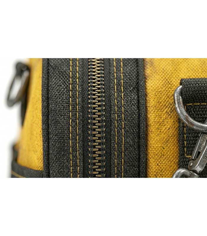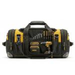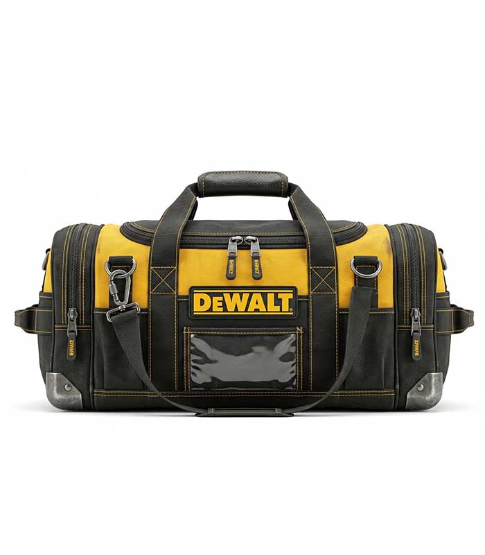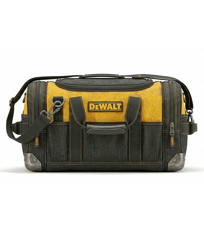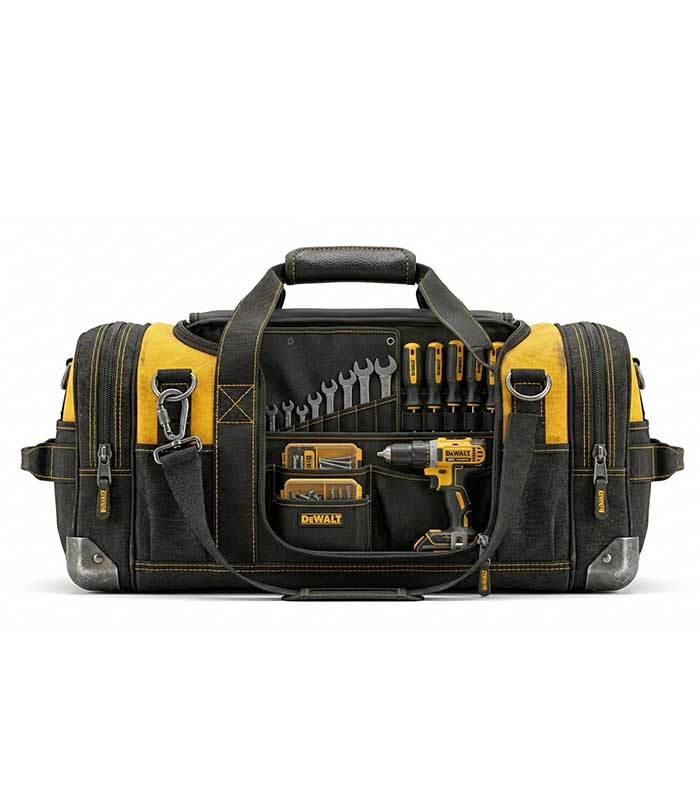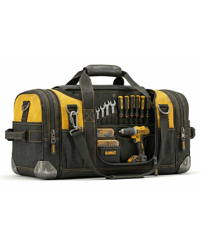 A rugged tool duffel bag designed for transporting and organizing construction tools and equipment on-site.