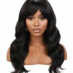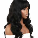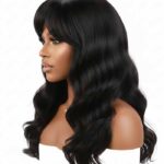 A stunning, long black synthetic or human hair wig featuring voluminous, deep-set waves and a flattering, expertly-cut fringe/bangs. This full-bodied style offers an instant transformation, creating a look of effortless glamour and sophistication, perfect for daily wear or special occasions.