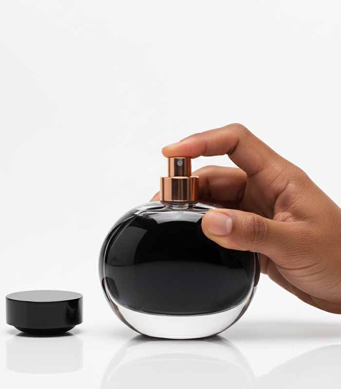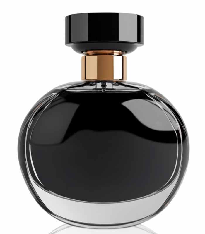 - Sleek Design: Round, dark glass bottle with high-gloss black cap and gold collar.