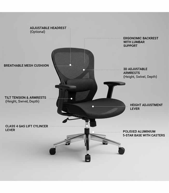 Fully adjustable ergonomic office chair with breathable mesh back, lumbar support, multi-tilt mechanism and height-adjustable armrests for long work sessions.