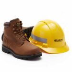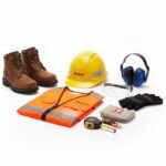 Comprehensive personal protective equipment kit including helmet, gloves, goggles, reflective vest, and boots for construction safety.
