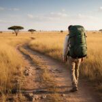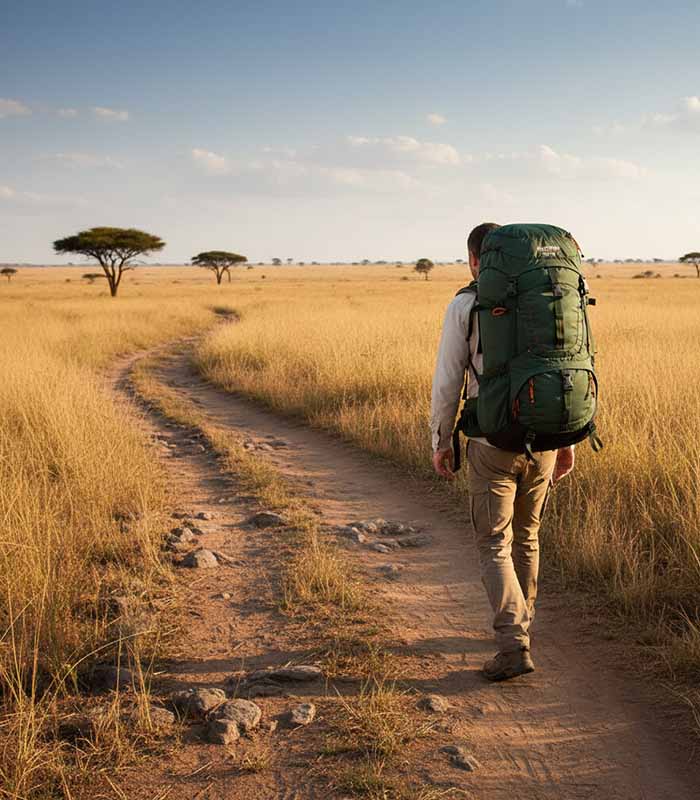 Durable and spacious trekking backpack with multiple compartments, hydration pack support, and adjustable straps for safari, hiking, and outdoor adventures.