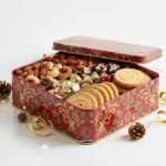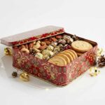 A delicious assortment of snacks such as roasted nuts, chocolate bites, dried fruit, and festive cookies. A